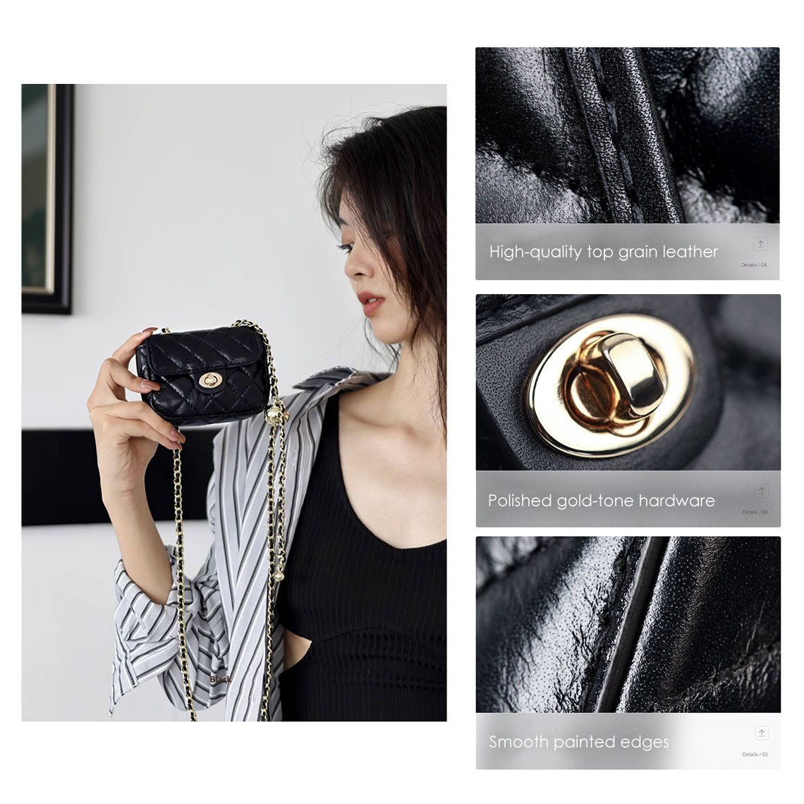 ✪ Main FeaturesWays to Wear: Crossbody Bag/Shoulder BagMaterial: Top grain leatherLining: Faux leather✪ ColorColor: BlackHardware Color: Gold-tone metal hardware