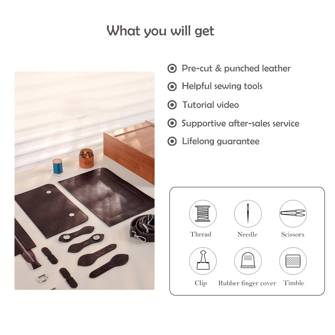 • 15 pre-cut leather pieces with pre-punched stitching holes to begin your leather kit. A leather shoulder strap.